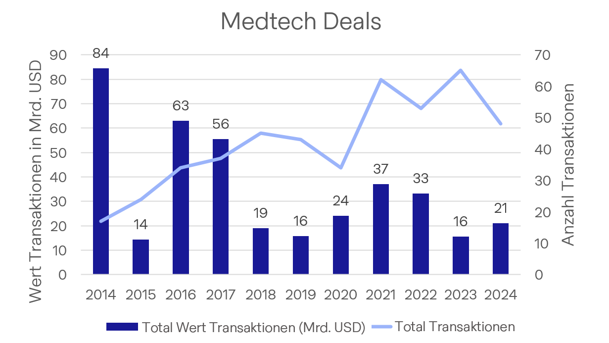 2024 gab es insgesamt 48 M&A-Transaktionen im Medizintechniksektor mit einem Gesamtvolumen von USD 21 Mrd. Zu den grössten Deals zählte die Übernahme von Shockwave durch Johnson & Johnson für USD 12 Mrd., der Verkauf des Critical-Care-Geschäfts von Edwards Lifesciences an Becton Dickinson für USD 4.2 Mrd. sowie der Kauf von Axonics durch Boston Scientific für USD 3.3 Mrd. Shockwave und Axonics sind klassische Beispiele dafür, wie grosse Medizintechnikunternehmen innovative, schnell wachsende Firmen übernehmen, um ihr Umsatzwachstum zu beschleunigen und ihre Vertriebsstrukturen optimal zu nutzen.